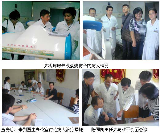 2011年6月20日至6月24日,兩名國(guó)外專家在南充市川北醫(yī)學(xué)院附屬醫(yī)院燒傷科參觀學(xué)習(xí)。其間,在周國(guó)富主任醫(yī)師,項(xiàng)曉燕主治醫(yī)師,陳剛主治醫(yī)師及其他科內(nèi)醫(yī)護(hù)人員的帶領(lǐng)下,外國(guó)專家每天到病 房觀察燒傷病人創(chuàng)面在再生醫(yī)療技術(shù)的幫助下,如何一天天原位再生復(fù)原;同時(shí),為了更好的達(dá)到此次學(xué)習(xí)目的,在科內(nèi)專門組織了數(shù)次科內(nèi)的小型討論會(huì),專門對(duì)大面積燒傷患者系統(tǒng)治療方面如何進(jìn)行補(bǔ)液,抗感染等要點(diǎn)作了深入的研討;通過深入回顧科內(nèi)年初成功搶救的一例大面積燒傷患者的病歷資料,國(guó)外專家對(duì)系統(tǒng)治療的要點(diǎn)有了深刻的把握,尤其是與傳統(tǒng)方法的區(qū)別。