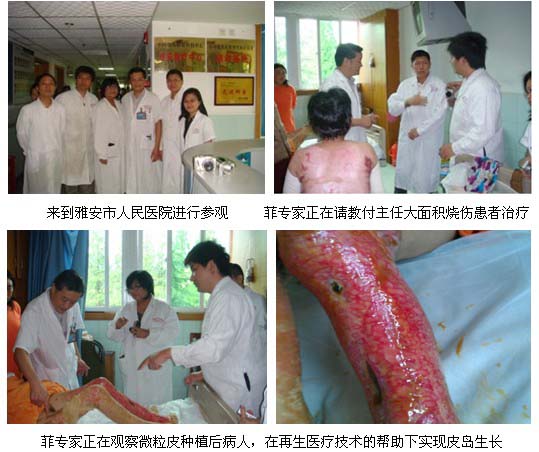 2011年6月27日至7月2日,兩名專家來到雅安市人民醫(yī)院燒傷科進(jìn)行學(xué)習(xí)再生醫(yī)療在介紹了微粒皮種植的流程;其間有一例患者正從微粒皮種植的手術(shù)中逐漸恢復(fù),傷口上生長(zhǎng)的皮島正在連接成片。付主任解釋說,如果按照傳統(tǒng)的方法換藥,種植的微粒皮是不可能在創(chuàng)面上存活并且生成皮島,正是有了再生醫(yī)學(xué)技術(shù)獨(dú)有的干細(xì)胞培養(yǎng)過程,才使得微粒皮種植培養(yǎng)皮島得以實(shí)現(xiàn)。此外,除了燒傷病人,各種外傷及慢性創(chuàng)面患者也都在再生醫(yī)療技術(shù)的幫助下獲得了良好的治療和康復(fù)。Dr. Mijares盡管只有一年再生醫(yī)療技術(shù)的使用經(jīng)驗(yàn),但仍然驚訝于再生醫(yī)療技術(shù)在多學(xué)科應(yīng)用所取得的成就并且表示回國(guó)后將致力于再生醫(yī)學(xué)在菲律賓的發(fā)展。