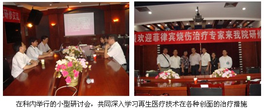 6月23日下午在燒傷科內(nèi)舉行了一次小型的學(xué)術(shù)交流會(huì),Dr. Mijares總結(jié)了她這周的學(xué)習(xí)體會(huì),并強(qiáng)調(diào)了系統(tǒng)治療的重要性及與傳統(tǒng)方法的區(qū)別;Dr. Sy向國(guó)內(nèi)的同行介紹了在菲律賓成為一個(gè)燒傷整形科醫(yī)生要經(jīng)歷的幾個(gè)階段;項(xiàng)曉燕主治醫(yī)師向兩位專家重點(diǎn)介紹了他們科在會(huì)陰部燒傷的治療經(jīng)驗(yàn)及體會(huì)。這次雙語(yǔ)學(xué)術(shù)交流在科內(nèi)引起了巨大的反響,雙方更加肯定了再生醫(yī)學(xué)的理論體系和優(yōu)良的實(shí)踐經(jīng)驗(yàn),菲律賓專家也表示回國(guó)后將繼續(xù)更廣泛深入地應(yīng)用再生醫(yī)學(xué)技術(shù)在不同創(chuàng)面病人身上。