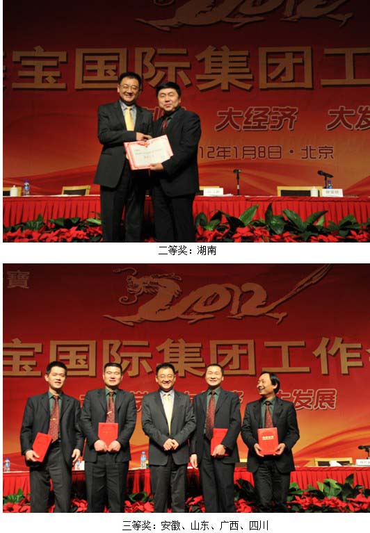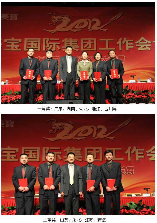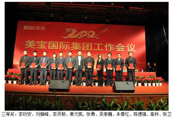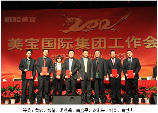 美寶燒傷創(chuàng)瘍集團2011年度市場經(jīng)營業(yè)績表彰大會于2012年1月8日14:00在長安大飯店拉開帷幕。這次會議由燒傷創(chuàng)瘍集團副總裁張坤主持,出席會議的有美寶國際集團董事局主席徐榮祥、燒傷創(chuàng)瘍集團總裁楊智斌及燒傷創(chuàng)瘍集團全體人員,并由徐榮祥主席親自為所有獲獎人員頒獎。