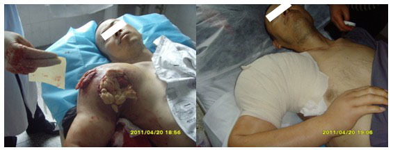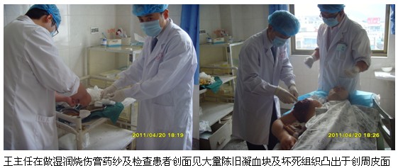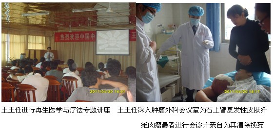 會后在腫瘤外科及醫(yī)務(wù)科姜主任的邀請下王主任來到了腫瘤外科為一位右上臂復(fù)發(fā)性皮膚纖維肉瘤患者會診,該患者在該醫(yī)院進(jìn)行了惡性腫瘤根治手術(shù)后發(fā)生局部轉(zhuǎn)移,后又到云南省某腫瘤醫(yī)院進(jìn)行了第二次腫瘤切除術(shù),但術(shù)后手術(shù)切口不愈并向周圍潰爛,創(chuàng)面惡化而且腫塊更大,每次換藥時創(chuàng)面出血不止,以至主管醫(yī)生不敢給患者創(chuàng)面進(jìn)行清創(chuàng)換藥,該醫(yī)院束手無策讓患者出院,王主任給患者查體時發(fā)現(xiàn)其整個右上臂高度腫脹,無法抬起,連頭都向右傾,患者非常痛苦,面色蒼白,經(jīng)初步檢查后王主任親自為患者進(jìn)行清創(chuàng)換藥,從患者創(chuàng)面中清除大量暗紫色陳舊凝血塊及大量液化壞死組織,創(chuàng)面周圍皮下組織完全液化壞死,形成巨大潛腔,部分皮膚因液化壞死組織未及時清除積聚皮下高度擴(kuò)張而發(fā)生散在性壞死并即將潰破,隨著大量壞死組織及陳舊凝血塊被清除,創(chuàng)面及創(chuàng)腔得到減壓,創(chuàng)面及潛腔放置美寶濕潤燒傷膏藥藥紗做引流清創(chuàng)及壓迫止血作用后創(chuàng)面出血及滲血停止,看著患者的表情由開始的痛楚逐漸變得輕松起來,把在場的醫(yī)護(hù)人員都看得目瞪口呆,對再生醫(yī)療技術(shù)贊不絕口。他們沒想到在權(quán)威的省腫瘤醫(yī)院那些專家們都無從下手又給推到他們的基層醫(yī)院,而運(yùn)用再生醫(yī)療技術(shù)在短短的一個多小時就解決了一換藥就出血,并把腫塊減到最小,讓患者如釋重負(fù)了。