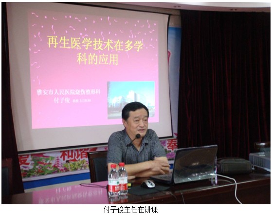 2012年7月18日下午,應(yīng)醫(yī)院的邀請(qǐng),中國(guó)中西醫(yī)結(jié)合學(xué)會(huì)燒傷專業(yè)委員會(huì)主任委員、雅安市人民醫(yī)院燒傷科主任付子俊來(lái)到該院,舉辦國(guó)家級(jí)繼續(xù)教育項(xiàng)目《中西醫(yī)結(jié)合創(chuàng)面治療新進(jìn)展》學(xué)習(xí)班,峨眉山市的29家醫(yī)療單位共計(jì)100多位學(xué)員到場(chǎng)接受繼續(xù)再教育。會(huì)議由醫(yī)院科教科科長(zhǎng)陳元主持,并就再生醫(yī)療技術(shù)做了簡(jiǎn)單的介紹,隨后,付主任開(kāi)始正式授課,付主任深入淺出的以理論知識(shí)為切入點(diǎn),通過(guò)大量科室應(yīng)用效果的病例展示圖文并茂的為在場(chǎng)的學(xué)員講解再生醫(yī)療技術(shù),并重點(diǎn)講述了再生醫(yī)療技術(shù)應(yīng)用的原則和要點(diǎn)。此次講座全程近3個(gè)小時(shí),會(huì)議全場(chǎng)始終保持安靜,學(xué)員聽(tīng)得津津有味。授課結(jié)束后,還進(jìn)行了學(xué)員提問(wèn),付主任也一一做了詳細(xì)的解答。