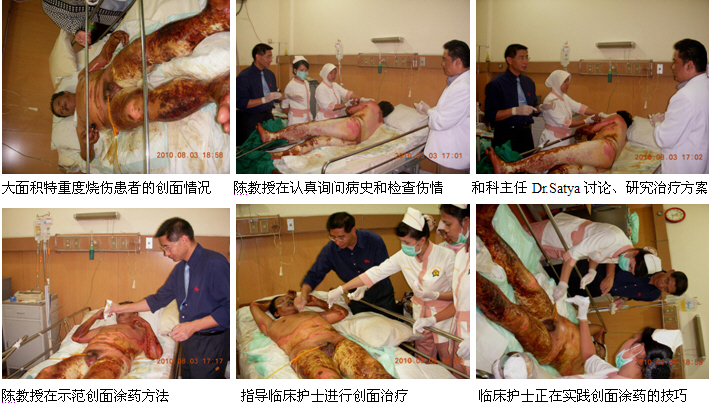 3、8月3日下午,陳教授一行完成了在Fatmawati hospital的培訓(xùn)任務(wù)后,馬上又應(yīng)邀到雅加達(dá)市的Harapan Bunda hospital會(huì)診、指導(dǎo)一例大面積特重度燒傷的患者。該患者是一名男性,47歲。因被火焰燒傷全身而入院。臨床診斷:1、大面積特重度燒傷(75%TBSA深I(lǐng)I度---深I(lǐng)II度);2、中度吸入性損傷。由于患者燒傷面積大、深度深,且是該院收治的第一例特重度燒傷患者,為了更好地使用燒傷再生醫(yī)學(xué)技術(shù)治療該患者,醫(yī)院特地邀請陳教授對該患者進(jìn)行會(huì)診和指導(dǎo)。陳教授到了病房后首先聽取了病情匯報(bào),然后認(rèn)真詢問了病史、查閱了病歷資料、護(hù)理記錄和進(jìn)行了細(xì)致的體格檢查,并結(jié)合該病例的具體傷情和情況,提出了一整套具體的全身系統(tǒng)治療和創(chuàng)面治療方案。討論和制定了治療方案后,陳教授親自為大家示范了深度燒傷痂皮的耕耘減張技術(shù)和燒傷濕潤暴露療法的創(chuàng)面治療方法。