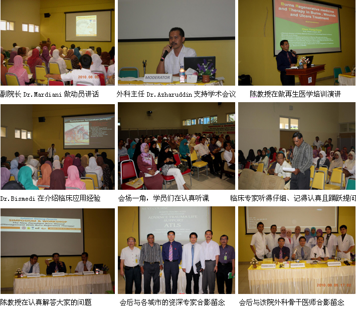 4、8月5日上午10時(shí),由印尼醫(yī)師學(xué)會(huì)主辦、Zainul Abidin Hospital承辦的Banda Aceh省級燒傷再生醫(yī)學(xué)臨床培訓(xùn)班(省級繼續(xù)教育項(xiàng)目,學(xué)分12分)在Zainul Abidin Hospital學(xué)術(shù)報(bào)告廳里成功舉辦。Zainul Abidin Hospital是當(dāng)?shù)刈畲蟮慕虒W(xué)醫(yī)院,500病床,醫(yī)院正在計(jì)劃利用再生醫(yī)學(xué)技術(shù)的優(yōu)勢籌建燒傷中心。來自全省3個(gè)主要城市的5家政府醫(yī)院和其它20多家私營醫(yī)院的120多名臨床醫(yī)師、護(hù)士參加了這次培訓(xùn)會(huì)。該院副院長Dr.Mardiani到會(huì),并做動(dòng)員講話。學(xué)術(shù)交流由醫(yī)院的大外科主任Dr. Azharuddin主持,陳教授應(yīng)邀作了“燒傷再生醫(yī)學(xué)與療法在燒傷、創(chuàng)瘍疾病治療的臨床規(guī)范應(yīng)用”的培訓(xùn)演講。另外,該院的整形、燒傷外科醫(yī)師Dr.Bismedi結(jié)合自己近期應(yīng)用再生醫(yī)學(xué)技術(shù)治療的2例燒傷患者向大家介紹了臨床應(yīng)用的經(jīng)驗(yàn)和體會(huì)。培訓(xùn)班的學(xué)術(shù)氛圍濃厚,大家學(xué)習(xí)、交流再生醫(yī)學(xué)技術(shù)的熱情高漲,效果理想。