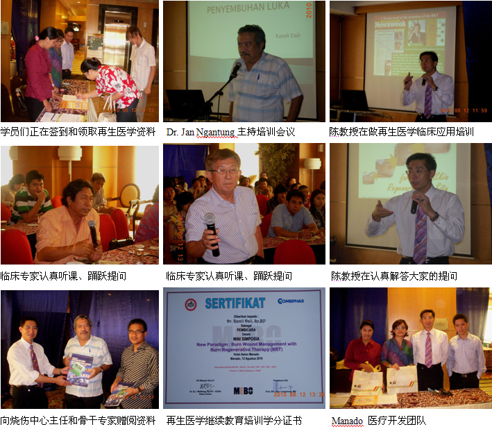 6、8月12日上午9時(shí),由醫(yī)師學(xué)會(huì)主辦的Manado省級燒傷再生醫(yī)學(xué)臨床培訓(xùn)班(省級繼續(xù)教育項(xiàng)目,學(xué)分8分)在Aston Hotel酒店的會(huì)議室里舉辦,來自全省主要的4個(gè)城市的8家政府醫(yī)院和其它20多家私營醫(yī)院的89名臨床醫(yī)師、護(hù)士參加了這次培訓(xùn)會(huì)。培訓(xùn)會(huì)由Manado 總醫(yī)院燒傷整形外科主任Dr. Jan Ngantung主持,陳教授應(yīng)邀作了“燒傷再生醫(yī)學(xué)與療法在燒傷、創(chuàng)瘍疾病治療的臨床規(guī)范應(yīng)用”的培訓(xùn)演講,很受大家的歡迎,達(dá)到了較理想的培訓(xùn)效果。