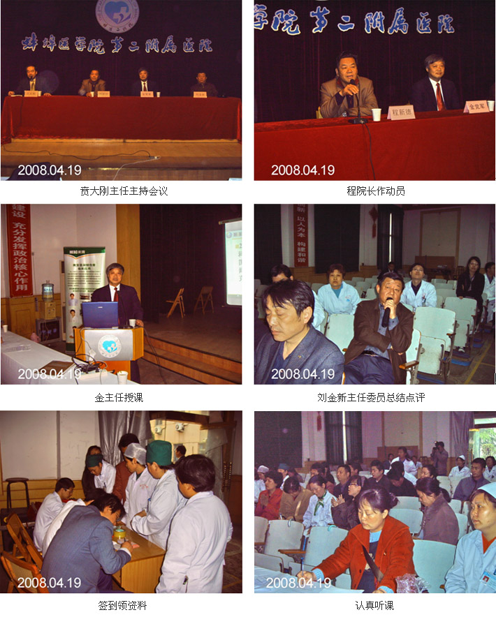 2008年4月19日蚌埠市暴雨,學員仍冒雨參加上午由中國中西醫(yī)結(jié)合學會燒傷專業(yè)委員會主辦,蚌埠市醫(yī)附二院承辦的《燒傷皮膚再生醫(yī)療技術(shù)診治護理培訓班》在醫(yī)附二院會議廳隆重召開。出席這次培訓班的有醫(yī)學會外科分會主任委員劉金新、醫(yī)院領(lǐng)導程新德院長。外科主任賁大剛主持會議,程院長首先對再生醫(yī)學技術(shù)療效顯著、應用簡單方便,非常適合基層醫(yī)務人員的特點給與了充分的肯定并作簡要動員。同時勉勵廣大學員珍惜這次學習機會,通過這次會議開闊醫(yī)學發(fā)展視野、了解醫(yī)學發(fā)展動態(tài)、掌握實用醫(yī)療技術(shù)。來自全市基層醫(yī)院、鄉(xiāng)鎮(zhèn)衛(wèi)生院、臨床一線醫(yī)護人員共150多人。