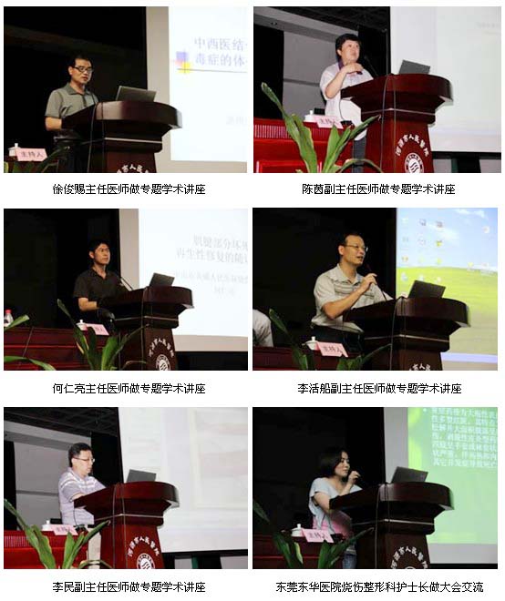 王洪生研究員首先以“燒傷皮膚原位再生復(fù)原技術(shù)在重度以上燒傷系統(tǒng)治療的要點(diǎn)”為題進(jìn)行了專(zhuān)題學(xué)術(shù)講座;隨后,唐乾利教授講解了“皮膚潰瘍創(chuàng)面處理的中西醫(yī)基礎(chǔ)與臨床研究近況”;王達(dá)利教授講授了“瘢痕疙瘩來(lái)源干細(xì)胞的生物學(xué)特性鑒定”;賀全勇教授講授了“燒傷感染的防治”;譚軍教授講授了“點(diǎn)陣激光治療增生性瘢痕”;張一鳴教授講授了“燒傷瘢痕的外科治療”; 省內(nèi)專(zhuān)家廣東省中西醫(yī)結(jié)合學(xué)會(huì)燒傷專(zhuān)業(yè)委會(huì)副主任委員、中山大學(xué)附屬五院燒傷整形科主任辛儉副主任醫(yī)師;廣東省中西醫(yī)結(jié)合學(xué)會(huì)燒傷專(zhuān)委會(huì)副主任委員、深圳陽(yáng)光醫(yī)院院長(zhǎng)張華彬主任醫(yī)師;廣東省中西醫(yī)結(jié)合學(xué)會(huì)燒傷專(zhuān)委會(huì)副主任委員、深圳市第六人民醫(yī)院梁智主任醫(yī)師;廣東省中西醫(yī)結(jié)合學(xué)會(huì)燒傷專(zhuān)委會(huì)副主任委員、廣東醫(yī)學(xué)院附屬惠州醫(yī)院(惠州市中心醫(yī)院)燒傷整形科主任徐俊賜主任醫(yī)師;廣東省中西醫(yī)結(jié)合學(xué)會(huì)燒傷專(zhuān)業(yè)委員會(huì)常委、深圳市龍崗中心醫(yī)院燒傷整形科主任陳茵副主任醫(yī)師;廣東省中西醫(yī)結(jié)合學(xué)會(huì)燒傷專(zhuān)業(yè)委員會(huì)委員、佛山南海人民醫(yī)院燒傷整形科主任李民副主任醫(yī)師;廣東省中西醫(yī)結(jié)合學(xué)會(huì)燒傷專(zhuān)業(yè)委員會(huì)常委兼秘書(shū)、中山黃圃人民醫(yī)院皮膚與燒傷創(chuàng)瘍科主任何仁亮主任醫(yī)師;廣東省中西醫(yī)結(jié)合學(xué)會(huì)燒傷專(zhuān)業(yè)委員會(huì)常委、開(kāi)平市婦幼保健院院長(zhǎng)李活船副主任醫(yī)師分別以“小兒重度燒傷治療”、“皮膚擴(kuò)張技術(shù)在燒傷瘢痕中的運(yùn)用”、“皮膚圓錐體結(jié)構(gòu)的病理學(xué)觀察”、“皮膚微粒皮種植修復(fù)大面積燒傷創(chuàng)面”、“中西醫(yī)治療燒傷膿毒癥”為題進(jìn)行了專(zhuān)題講座。在學(xué)術(shù)講座中來(lái)自國(guó)內(nèi)各省的專(zhuān)家利用大量詳實(shí)的圖片資料,重點(diǎn)向與會(huì)的專(zhuān)家、學(xué)者和醫(yī)護(hù)人員講述了燒傷皮膚原位再生復(fù)原醫(yī)療技術(shù)等中西醫(yī)結(jié)合方法在特重度燒傷并發(fā)癥及增生性瘢痕防治方面的進(jìn)展,由于學(xué)術(shù)講座重點(diǎn)突出、內(nèi)容豐富、貼近臨床,方法簡(jiǎn)便實(shí)用、臨床效果顯著,與會(huì)代表反映強(qiáng)烈。學(xué)習(xí)班結(jié)束后,學(xué)員們進(jìn)行了廣泛而深入地交流。