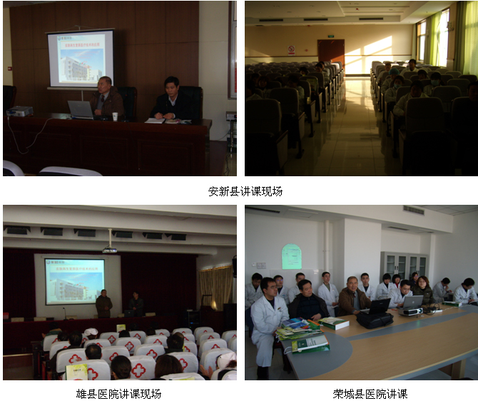 河北省安新縣、容城、雄縣地處京、津、石金三角地帶。華北平原最大的淡水湖泊—白洋淀就位于這三縣境內(nèi)。2011年1月,經(jīng)這三縣縣醫(yī)院領(lǐng)導(dǎo)邀請,中國中西醫(yī)結(jié)合學(xué)會燒傷專業(yè)委員會常委、中國燒傷創(chuàng)瘍科技中心臨床部主任樊兆宗教授于2011年1月12—14日分別在這三個縣縣醫(yī)院會議室進(jìn)行了“原位再生醫(yī)療技術(shù)的臨床應(yīng)用”專題學(xué)術(shù)講座。參加這次培訓(xùn)的有安新縣縣醫(yī)院,容城縣醫(yī)院,雄縣縣醫(yī)院院長各科室主任醫(yī)生護(hù)士共計150多人。