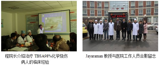 病房查房結(jié)束后,醫(yī)院科室王主任簡要介紹了醫(yī)院在應(yīng)用燒傷再生醫(yī)學(xué)的發(fā)展歷程、展示了應(yīng)用燒傷再生醫(yī)學(xué)所治療的典型病例,包括大面積深度化學(xué)燒傷病例、大面積深度火焰燒傷病例、熱燙傷病例、熱壓傷病例、電燒傷病例以及應(yīng)用原位再生技術(shù)所治療的皮膚慢性潰瘍病例、感染性創(chuàng)面病例、褥瘡病例等。隨后,程院長分享了應(yīng)用燒傷再生醫(yī)學(xué)成功救治了TBSA98%化學(xué)燒傷病人的臨床經(jīng)驗,Jayaraman教授感嘆的說:“燒傷再生醫(yī)學(xué)是國際燒傷界的一門偉大的科學(xué),你們能夠救活TBSA98%的深度燒傷病人,還有什么樣的燒傷病人你們救不活?希望以后我們能多開展一些學(xué)術(shù)交流活動,讓我們印度的燒傷醫(yī)生都能夠?qū)W習(xí)到燒傷再生技術(shù),造福印度人民?!?/FONT>