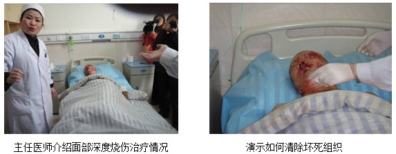 隨后,程院長帶領(lǐng)Jayaraman教授進(jìn)行了病房查房活動。在查房的過程中,醫(yī)院主任醫(yī)師詳細(xì)介紹了應(yīng)用燒傷再生療法如何治療深度創(chuàng)面,包括開創(chuàng)引流、耕耘減張、壞死組織薄化、壞死組織液化排除等技術(shù),深深的吸引了Jayaraman教授。Jayaraman教授說:“我們的燒傷中心對于深二度以上的創(chuàng)面,一般都采用削痂植皮技術(shù),但今天我親眼看見了一種對壞死痂皮處理的一套新技術(shù)---創(chuàng)面無損傷、病人無痛苦、壞死組織自動液化排除, 好技術(shù)、好技術(shù)?!?/FONT>