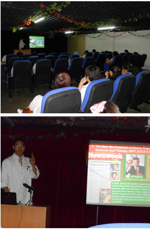 北京片區(qū)在陳永翀主任幫助下聯(lián)絡醫(yī)院科教科,于在2012年6月14號下午,在該院培訓大廳進行再生技術和產品的繼續(xù)教育培訓,參加科室有外科、骨科、兒科、糖尿病科的三十多名醫(yī)護人員。陳永翀主任所講內容不僅涉及燒傷創(chuàng)面修復,還在糖尿病潰瘍、褥瘡方面結合病例進行講解,醫(yī)生們被再生技術的神奇療效深深吸引,會場學習氣氛濃厚,培訓結束后糖尿病科的醫(yī)生與陳主任進行了更細致的討論。