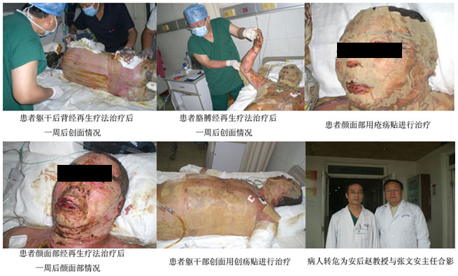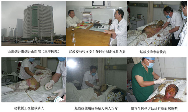 簡報(bào)三:9月14至9月24日,趙教授在山東煙臺(tái)市煙臺(tái)山醫(yī)院(三甲醫(yī)院)、中法友誼醫(yī)院指導(dǎo)搶救燒傷病人,該病人因苯甲酸爆炸致傷,燒傷面積為85%。奮戰(zhàn)一周,由傳統(tǒng)療法轉(zhuǎn)為再生技術(shù)治療,病人順利渡過休克期、感染期、糾正高鈉、高氯血癥、燒傷發(fā)熱癥狀,及時(shí)處理導(dǎo)管插入菌血癥險(xiǎn)情,使病人轉(zhuǎn)危為安。