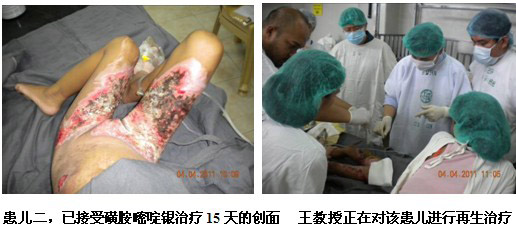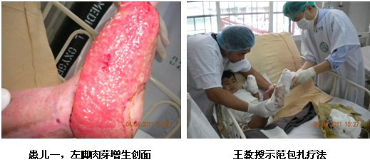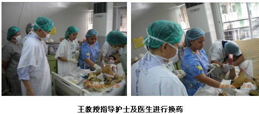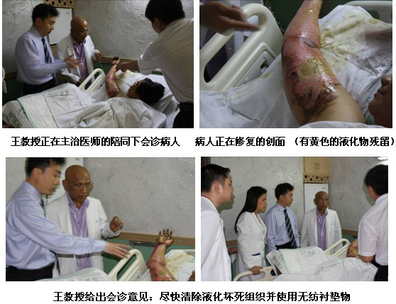 雖然培訓(xùn)結(jié)束了,但是一名外科高年資醫(yī)生盛情邀請王洪生教授到病房會診一名他們正在用再生醫(yī)學(xué)技術(shù)治療的燒傷患者。該病人是上肢深I(lǐng)I度和I度混合燒傷患者,正在接受經(jīng)典的暴露療法來治療。來到病房,當(dāng)王教授看到黃色的液化物仍殘留在創(chuàng)面時,他立即指出液化的壞死組織需要及時清除,并且強(qiáng)調(diào)需要使用無紡布的襯墊物,而不是現(xiàn)在所使用的棉質(zhì)被單。因?yàn)橹挥羞@樣才能保證創(chuàng)面濕潤環(huán)境的保持,促進(jìn)表皮干細(xì)胞的再生。主治醫(yī)生和患者對王主任的到來,表示熱烈歡迎,并非常感謝王主任的指導(dǎo)。他們表示馬上為患者換藥并清潔創(chuàng)面。