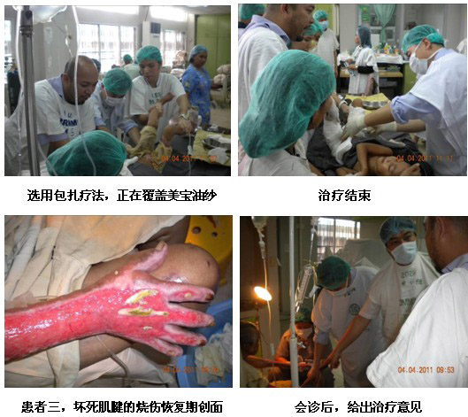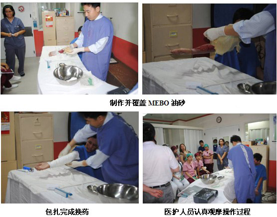 隨后王教授來到病房會診一名褥瘡患者,并演示換藥程序。該病人的壓瘡在會診前有壞死腐皮沒有清除。王主任親自示范如何徹底清創(chuàng),并展示包扎療法的操作過程。有一名醫(yī)生表示,原先他只是涂上燒傷膏,然后包扎,并沒有覆蓋MEBO油砂,此次培訓(xùn)會后,他知道了并規(guī)范了包扎療法的使用。整個會診及換藥過程持續(xù)了35分鐘,醫(yī)生們表示收益匪淺,雖然使用了MEBT/MEBO很多年,但是仍然還有很多需要深入學(xué)習(xí)并實(shí)踐的知識。