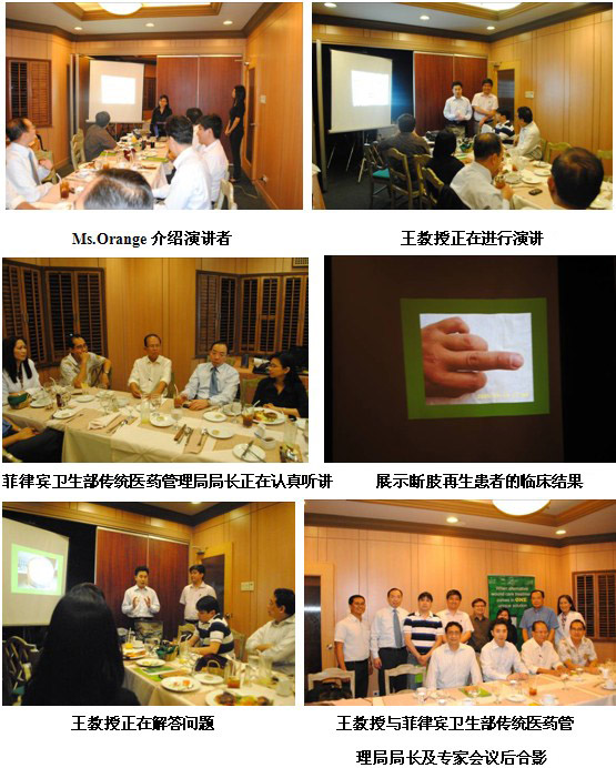 然后,王教授一行又來到CGH (Chinese General Hospital http://en.wikipedia.org/wiki/Chinese_General_Hospital_College_of_Nursing_and_Liberal_Arts), 醫(yī)院普通外科,該院是華僑開設(shè)的私人醫(yī)院,中文名字叫崇仁中心醫(yī)院。該院是第一次做醫(yī)療開發(fā),準(zhǔn)備在培訓(xùn)會后引進(jìn)MEBT/MEBO。主要內(nèi)容涉及MEBO適應(yīng)癥典型案例介紹和如何使用MEBT/MEBO技術(shù)和產(chǎn)品。會后,該科室主任詢問此技術(shù)在糖尿病足治療的具體步驟。晚上6點(diǎn),與菲律賓衛(wèi)生部傳統(tǒng)醫(yī)藥管理局局長及8名來自不同醫(yī)院和科室的主任進(jìn)行圓桌交流和會談,有一名醫(yī)生第二次見面,其他均為第一次,但是他們都正在使用美寶治療病人。主要涉及的話題為MEBO適應(yīng)癥典型案例介紹和如何使用MEBT/MEBO技術(shù)和產(chǎn)品。整個交流從提問環(huán)節(jié)開始,然后有針對性地進(jìn)行講課,整個過程直到晚上11點(diǎn)才結(jié)束。醫(yī)生的主要問題集中在1.該技術(shù)如何抗感染;2. 如何防治瘢痕增生;3. 骨髓開窗術(shù)后很容易發(fā)生骨髓炎,再生醫(yī)學(xué)技術(shù)是如何防治的。會后醫(yī)生非常滿意,對MEBT/MEBO所達(dá)到的臨床效果非常滿意。