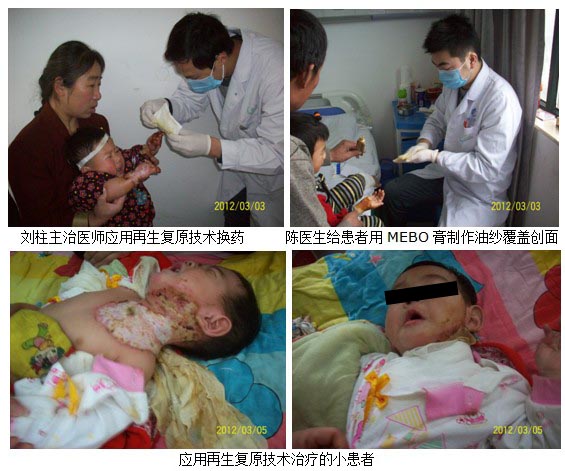 2011年11月14日~17日,杜福勤主任再次來到燒傷整形科,在齊國(guó)選主任的帶領(lǐng)下看望了住院的燒傷和整形患者,并給予再生技術(shù)規(guī)范換藥。15日給予示范換藥治療后,得到患者及家屬的認(rèn)可和歡迎,特別是幼兒患者,應(yīng)用再生技術(shù)換藥后患兒立即停止哭鬧。16日,應(yīng)用MEBO創(chuàng)瘍貼給頸胸部燙傷患兒和上下肢燒傷植過自體皮的患兒換藥治療,收到了良好的臨床效果。