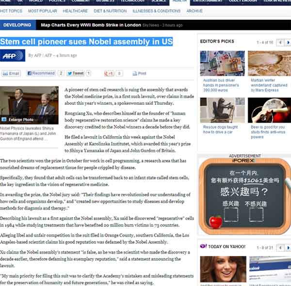 徐稱這是第一例起訴諾獎(jiǎng)委的官司。他在1984年發(fā)現(xiàn)了“再生”細(xì)胞,當(dāng)時(shí)他正在從事治療技術(shù)的研究,該治療技術(shù)已經(jīng)使73個(gè)國家的兩千萬燒傷患者受益。