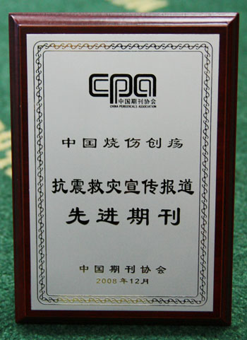 中國期刊協(xié)會為了表彰先進(jìn),于今年8月在全國期刊界開展了評選抗震救災(zāi)宣傳報(bào)道先進(jìn)期刊及先進(jìn)個人的活動,在經(jīng)過中宣部出版局、民政部、新聞出版總署有關(guān)部門的領(lǐng)導(dǎo)和業(yè)界專家組成的評審委員會進(jìn)行認(rèn)真評審后,決定授予106種期刊“全國抗震救災(zāi)宣傳報(bào)道先進(jìn)期刊”的榮譽(yù)稱號,《中國燒傷創(chuàng)瘍雜志》在全國九千多種期刊中涌現(xiàn)了出來,獲此殊榮。