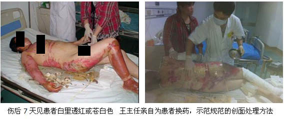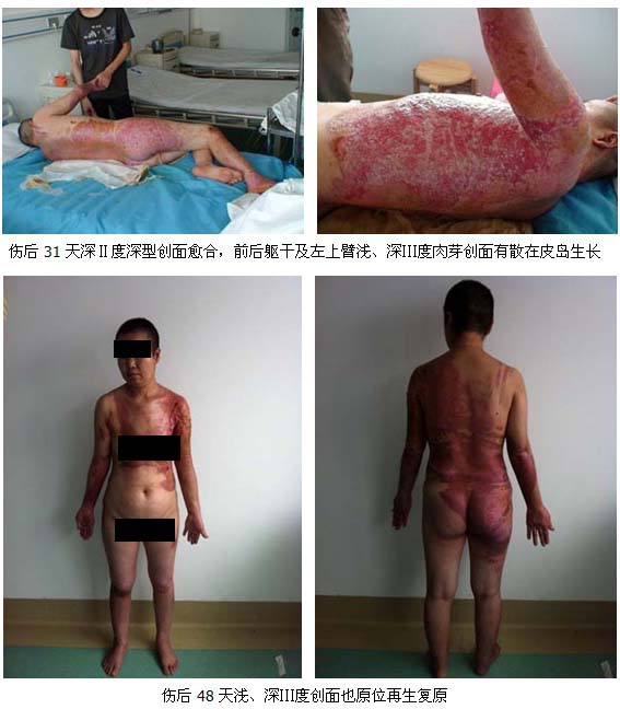 因該患者是該醫(yī)院于2007年成立燒傷外科以來收治傷情最嚴重的大面積燒傷患者,為確保對該患者的成功救治,2011年5月4日,應該醫(yī)院邀請中國中西醫(yī)結合學會燒傷專業(yè)委員會常委、中國燒傷創(chuàng)瘍雜志社副總編輯、北京燒傷創(chuàng)瘍研究所副所長、臨床部主任王洪生研究員星夜兼程于當日下午5時趕到該醫(yī)院為該例大面積燒傷患者會診,指導對該患者的救治工作。因該例大面積深度燒傷三度燒傷創(chuàng)面在30%以上,為確?;颊叩钠椒€(wěn)康復,王主任分別于患者傷后7天、15天、31天,三下北海,全程跟蹤指導對患者的救治工作。經(jīng)過該科醫(yī)護人員近50天夜以繼日的精心治療,患者深Ⅱ度及淺Ⅲ度、深Ⅲ度創(chuàng)面經(jīng)全程規(guī)范應用燒傷皮膚原位再生復原技術,未植皮實現(xiàn)原位再生復原(生理性愈合)。
