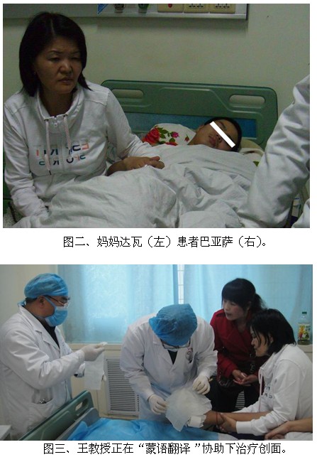 由于親戚臨時(shí)有事沒來,母子二人為了保住巴亞薩凍傷的腳,從蒙古國不遠(yuǎn)千里來看病。大家只知道躺在病床上的小伙子名叫巴亞薩,20歲,右腳部被嚴(yán)重凍傷14天,腳趾頭變黑。初時(shí)只見蒙古國小伙的右腳纏著厚厚的紗布繃帶,旁邊的紙上寫著他的名字(BAYASAA)。當(dāng)王教授問他問題時(shí),他只能用迷惑和搖頭來回答。由于語言不通,巴亞薩喊疼時(shí)大家都聽不懂。他們出去買點(diǎn)食物都得給親戚打電話問清楚才能出去買。在“診療計(jì)劃”也無法告知患者的難題下,王教授和醫(yī)生求助了電視臺、報(bào)紙等媒體向社會征集蒙古語翻譯的志愿者,好解決和患者的交流問題。