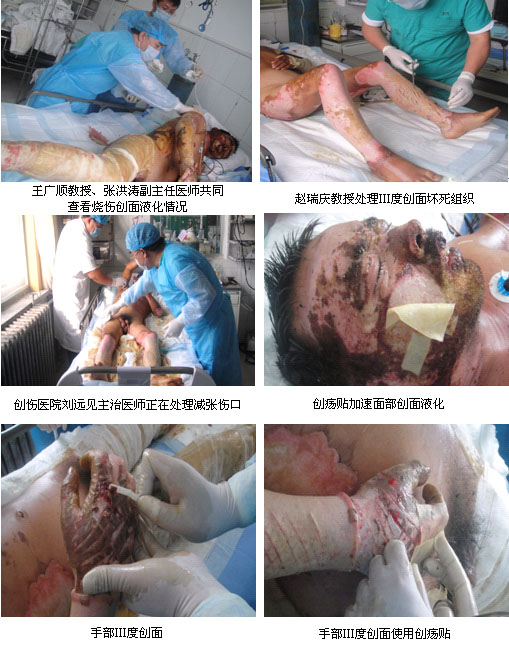9月16日,牡丹區(qū)呂陵鎮(zhèn)某特種鋼煉鋼廠工人們正在翻砂澆鑄正常作業(yè),下午13:00時因翻砂磨具受潮,燒鑄鐵水后濺起的鐵水、引起蒸汽、沙粒、汽霧、把正在作業(yè)的翻砂工人馮某、霍某掀倒,導(dǎo)致2名工人大面積燒傷,事后鋼廠工友們用車將2人急送到菏澤市創(chuàng)傷醫(yī)院進行搶救,醫(yī)院領(lǐng)導(dǎo)得知后立即開啟緊急綠色急救通道,直接由急診室轉(zhuǎn)入手術(shù)室、ICU病房,聯(lián)合組成普外科、ICU搶救小組,患者馮某:燒傷面積 80%TBSA;患者霍某:燒傷面積60%TBSA,兩名患者均為Ⅲ度燒傷創(chuàng)面各占到50% TBSA。中國中西醫(yī)結(jié)合學(xué)會燒傷專業(yè)委員會委員趙瑞慶教授、王廣順教授也在第一時間趕到搶救現(xiàn)場與該院醫(yī)生共同討論分別對2名傷員采取人性化的個體搶救方案,針對危重患者積極采取開通靜脈雙通道,抗休克、抗感染等支持療法,創(chuàng)面處理全部使用燒傷再生醫(yī)療技術(shù),Ⅲ度燒傷創(chuàng)面采用耕耘減張后,規(guī)范全程運用再生醫(yī)療技術(shù)救治,經(jīng)過該院醫(yī)生的積極搶救,在患者入院12天后,患者的病情得到了有效地控制,較平穩(wěn)的度過了休克期、感染期、目前創(chuàng)面進一步轉(zhuǎn)入后期處理階段。
