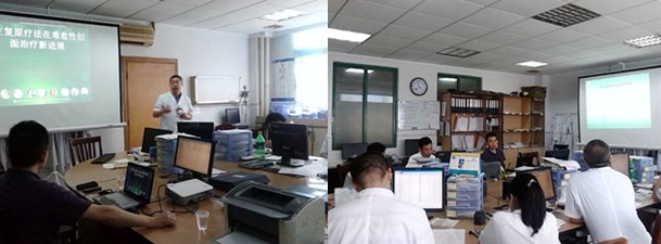 會(huì)議在下午3:00分在該科教研室兼辦公室舉行,黃武全主任主持學(xué)術(shù)會(huì)議,戴衛(wèi)平副院長(zhǎng)參加了會(huì)議,該科普外科、肛腸科、骨科、燒傷外科學(xué)組醫(yī)護(hù)人員認(rèn)真聆聽(tīng)了此次培訓(xùn)。王主任的專(zhuān)題學(xué)術(shù)報(bào)告分為三部分,在第一部分概述中,王主任重點(diǎn)講述了我國(guó)著名生命科學(xué)家、醫(yī)學(xué)家徐榮祥教授近年來(lái)在人體再生復(fù)原科學(xué)研究領(lǐng)域所取得的重大臨床及實(shí)驗(yàn)研究成果,2012年分別發(fā)表在《英國(guó)外科雜志》和《國(guó)際燒傷雜志》2篇綜述中有關(guān)磺胺嘧啶銀及含銀敷料等外用銀制劑用于急性創(chuàng)傷和燒傷創(chuàng)面會(huì)造成創(chuàng)面愈合延遲、增加疼痛和感染率的最新觀點(diǎn),以及再生復(fù)原療法的概念及其解決難愈性創(chuàng)面治療的機(jī)理;第二部分重點(diǎn)介紹了再生復(fù)原療法創(chuàng)面規(guī)范的處理方法;第三部分重點(diǎn)講述了再生復(fù)原療法在各類(lèi)難愈性創(chuàng)瘍創(chuàng)面治療要點(diǎn)及典型病例介紹,并結(jié)合大量的病例圖片講解了各類(lèi)深度燒傷創(chuàng)面、再生醫(yī)療技術(shù)在骨外露、鋼板外露、糖尿病足、動(dòng)脈閉塞癥、撕脫傷、斷肢再生、手術(shù)切口感染、褥瘡等各種難愈合創(chuàng)面的治療過(guò)程及要點(diǎn)。會(huì)議持續(xù)到近6點(diǎn)才結(jié)束。戴院長(zhǎng)代表醫(yī)院對(duì)王主任的到來(lái)表示感謝,并表示受益匪淺,王主任的講座進(jìn)一步加深了該院對(duì)原位再生技術(shù)的認(rèn)識(shí),他們表示將在臨床中更加規(guī)范的使用該項(xiàng)技術(shù),為患者造福!
