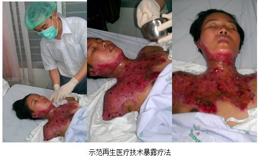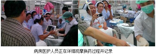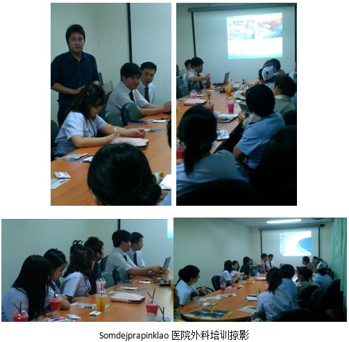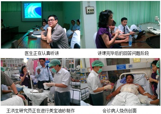 6月19日,美寶團隊驅(qū)車4個小時來到距離曼谷200多公里的南部Kampaeng Pet醫(yī)院意外傷害科室(Accident Ward)的4名醫(yī)生和15護士進行再生醫(yī)療技術(shù)在褥瘡的最新治療進展。其中,Dr. Akaropong是美寶的重點醫(yī)生,在2011年進行醫(yī)療開發(fā)的時候,該醫(yī)生已經(jīng)開始嘗試使用再生醫(yī)療技術(shù)。今年,他所在的科室的大多數(shù)燒傷病人都已經(jīng)開始使用該技術(shù)。講課結(jié)束完畢后,為了讓護士更加規(guī)范的使用再生醫(yī)療技術(shù),王洪生研究員親自為兩位燒傷患者進行了規(guī)范的包扎療法和暴露療法臨床操作。參加的醫(yī)護人員紛紛拿出自己的手機,記錄下整個操作過程。在會診病例時,來自中國的專家也吸引了該院內(nèi)科的醫(yī)生過來請教并學(xué)習(xí),討論關(guān)于胃腸道出血的再生治療措施。