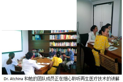 Dr. Atchina介紹說,她使用美寶燒傷膏在激光治療后的創(chuàng)面上,得到了很好的臨床療效。Dr. Atchina非常想知道再生醫(yī)療技術(shù)聯(lián)合激光治療各類瘢痕或者單獨治療各類創(chuàng)面的臨床經(jīng)驗和實際操縱方法。王洪生研究員通過各類不同的臨床對比圖片,詳細的展示了再生醫(yī)療技術(shù)在中國的成功應(yīng)用。Dr.Atchina詳細地詢問了創(chuàng)面及瘢痕治療的各類問題,最后表示非常豐富的臨床經(jīng)驗,非常棒的技術(shù)和產(chǎn)品,我正在做一些臨床對照研究,希望以后能深層次合作。美寶團隊回應(yīng)非常希望Dr. Atchina能夠總結(jié)出自己的經(jīng)驗并且發(fā)表到各類雜志、期刊。今年9月份,美寶會參加在愛丁堡舉辦的國際燒傷大會,類似的機會在未來會有很多,也希望Dr. Atchina能站在世界的舞臺上讓更多的人了解這項杰出的技術(shù)和產(chǎn)品。