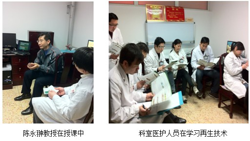 2012年3月30日上午九點,陳永翀教授應約來到骨傷科病區(qū)醫(yī)護辦公室,科室培訓班由骨傷科丁主任主持,病區(qū)醫(yī)護26人參加,陳教授以“皮膚原位再生醫(yī)療技術與創(chuàng)面治療”為題,做了40分鐘的演講,陳教授從皮膚原位再生醫(yī)療技術的創(chuàng)立、機理、臨床實踐進行了詳細的講解。展示了大量的臨床病例和圖片,參會的醫(yī)護人員均被皮膚原位再生技術的神奇效果深深的吸引。培訓結束后,陳教授和全體醫(yī)護進行了臨床交流,回答了醫(yī)護人員在臨床中遇到的各類創(chuàng)面治療問題,部分醫(yī)護人員對糖尿病足潰瘍創(chuàng)面的修復興趣很高,紛紛表示將進一步學習這項技術,早日應用于臨床中。