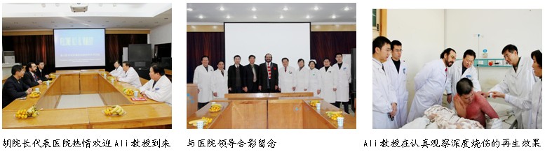 17日上午9時(shí),Dr. Ali在中國(guó)燒傷創(chuàng)瘍科技中心臨床部陳永翀主任和醫(yī)學(xué)英語(yǔ)專(zhuān)業(yè)翻譯張印的陪同下來(lái)到了泰山醫(yī)學(xué)院附屬醫(yī)院,醫(yī)院業(yè)務(wù)副院長(zhǎng)胡建功教授和醫(yī)務(wù)處楊曉雯處長(zhǎng)在醫(yī)院的多功能廳舉辦了簡(jiǎn)短的歡迎儀式,熱情歡迎Dr.Ali來(lái)到泰山醫(yī)學(xué)院附屬醫(yī)院進(jìn)行參觀考察和學(xué)術(shù)交流。歡迎儀式結(jié)束后,按照原定計(jì)劃,Dr.Ali在燒傷科徐西勝主任和護(hù)士長(zhǎng)的帶領(lǐng)下參觀考察了燒傷科病房及住院處的各種燒傷、創(chuàng)瘍患者的治療情況,目前燒傷科住院患者有26名,其中大面積燒傷有7名。Dr.Ali重點(diǎn)參加了5例大面積燒傷患者的不同治療階段的查房和病例討論,還觀摩了為2例大面積燒傷患者示范換藥的過(guò)程。在病房的參觀考察過(guò)程中,Dr.Ali一直都非常興奮和激動(dòng),他不停地向患者和家屬打招呼,不停地提問(wèn)、拍照和檢查再生愈合后的皮膚質(zhì)量,Dr.Ali感慨地講道,他曾經(jīng)到過(guò)美國(guó)和歐洲的世界上最好的燒傷中心參觀和考察,雖然他們的病房條件很好,但住院燒傷患者的救治成活率還達(dá)不到70%,而且在那里患者與家人被無(wú)情地分開(kāi),單獨(dú)隔離到一個(gè)完全陌生和封閉的環(huán)境里,他所見(jiàn)到的患者都是神情緊張、目光呆滯或情緒低落,患者每天都在驚恐中度日如年。今天,Dr.Ali看到采用燒傷再生醫(yī)學(xué)技術(shù)治療的大面積深度燒傷患者卻能夠在普通、開(kāi)放的病房里接受治療,在這里所看到的患者都是神情自若、精神飽滿(mǎn)、情緒穩(wěn)定、能吃、能動(dòng)、能睡,還能夠和家人、朋友進(jìn)行交談,換藥中還能夠配合醫(yī)師進(jìn)行翻身、抬腿等,而且整個(gè)病區(qū)沒(méi)有發(fā)現(xiàn)1例創(chuàng)面感染的患者。Dr.Ali 忍不住驚呼:燒傷再生醫(yī)學(xué)技術(shù)太神奇了!中國(guó)的燒傷醫(yī)師、護(hù)士太偉大了。