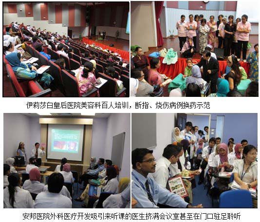本次醫(yī)療開發(fā)遍布了整個東馬和西馬近20家大型州級政府中心醫(yī)院,覆蓋科室分布為骨科、美容、普外、急診、燒傷、婦產(chǎn)、口腔科等,組織舉辦培訓(xùn)學(xué)習(xí)班數(shù)十余場,培訓(xùn)醫(yī)護(hù)人員近千名,會診病例十余次包括糖尿病足潰瘍、下肢靜脈潰瘍、剖腹產(chǎn)手術(shù)切口感染、糖尿病下頜面部潰瘍等。此行的醫(yī)療開發(fā)旨在介紹闡述再生醫(yī)學(xué)科學(xué)基本原理,樹立醫(yī)生的治療新理念,糾正單純換藥的概念,規(guī)范了技術(shù)操作流程及原則,解決了馬來醫(yī)生理論概念及臨床應(yīng)用等問題及質(zhì)疑,樹立并增強(qiáng)了醫(yī)生的信心,為今后的大范圍應(yīng)用打下來堅實的基礎(chǔ)。
