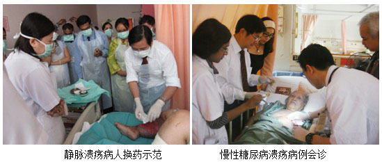 在多家醫(yī)院授課后,還安排了病人會診及不同創(chuàng)面換藥操作規(guī)范示范,每次的示范中醫(yī)療開發(fā)團(tuán)隊被醫(yī)院的業(yè)務(wù)人員層層包圍,爭先恐后地觀察記錄整個操作流程,生怕遺漏一絲一毫的細(xì)節(jié),并不時提出相關(guān)問題,胡教授都給予耐心、細(xì)致、全面的解答,使所有的示范教學(xué)活動開展的有聲有色、在活躍而嚴(yán)謹(jǐn)?shù)姆諊兄庇^有效地規(guī)范了醫(yī)務(wù)人員的技術(shù),提高了醫(yī)務(wù)水平。