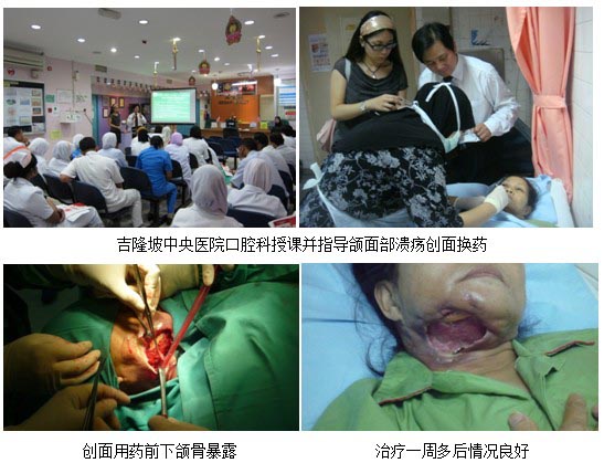 在整個醫(yī)療開發(fā)過程中,醫(yī)療開發(fā)團(tuán)隊也結(jié)識了許許多多醫(yī)界同仁并成為良好的伙伴,如Dr. Nurhalizah,她是在全馬最大政府醫(yī)院吉隆坡中央醫(yī)院婦產(chǎn)科工作的資深主任醫(yī)師,同時也是再生醫(yī)學(xué)忠實的追隨者和實踐人,在胡教授的指導(dǎo)下,經(jīng)她規(guī)范應(yīng)用再生醫(yī)學(xué)技術(shù)治療的多例婦產(chǎn)科手術(shù)切口感染病人很快就成功地治愈并康復(fù)出院。嘗到了先進(jìn)技術(shù)和產(chǎn)品帶來的勝利的喜悅后,她又無私地將該技術(shù)引薦給該院的口腔科,幫助該科解決一例頭疼的難愈性創(chuàng)面。這例有糖尿病史的病人在拔牙后感染引起右頜面部整個組織的潰爛,連下頜骨都暴露出來,慘不忍睹。經(jīng)胡教授的指導(dǎo)和示教換藥后一周,該患者的病情穩(wěn)定,創(chuàng)面明顯得到了改善,新生肉芽組織長勢良好,而隨后的授課講解進(jìn)一步打消了醫(yī)生們對下一步治療的所有疑惑和顧慮,掌握了要領(lǐng),使醫(yī)生們感到驚奇的同時建立了百倍的信心。