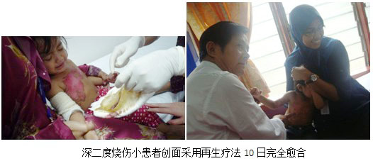 另一例會診的病例也是來自吉隆坡中央醫(yī)院,患者是該院康復(fù)科一名醫(yī)生年幼的女兒,不幸被開水燙傷,整個胸部和右上臂為深二度燒傷,在美寶醫(yī)療團(tuán)隊到來之前,他們使用干性輔料給予治療,不僅效果不明顯,且干性療法的紗布與創(chuàng)面嚴(yán)重粘連,使每次的換藥都成了孩子最難以忍受的折磨。萬般無奈之時,該醫(yī)生得知美寶醫(yī)療隊在大馬的情況并隨即發(fā)出求助,經(jīng)胡主任的會診,該小患者立刻改用再生療法并在10天之內(nèi)就全部愈合,換藥再也不哭不鬧,家人和醫(yī)生都十分感激。