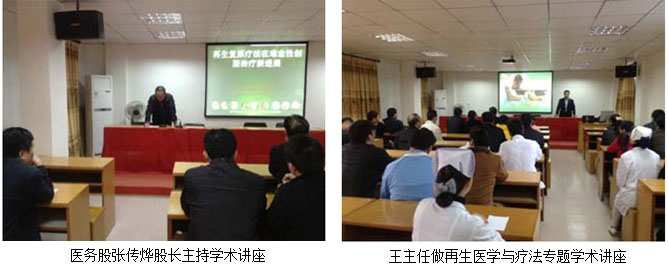 醫(yī)務(wù)股張傳燁股長提前等候在大門口迎接王主任的到來,會議室坐滿了醫(yī)院各相關(guān)科室的30多名醫(yī)務(wù)人員,在學(xué)術(shù)講座開始前,王主任首先向與會專家和醫(yī)護人員通報了我國著名生命科學(xué)家、醫(yī)學(xué)家徐榮祥教授在美國起訴諾獎委的相關(guān)信息,然后以圖文并茂和詳實的圖像資料把再生療法在臨床各個方面的規(guī)范化應(yīng)用作了深入淺出的演示講解,課后還就醫(yī)生們提出的臨床治療中各類問題一一作詳細的解答和指導(dǎo)。會后,彭俊生院長親自到來感謝并希望今后能得到更好的技術(shù)支持。