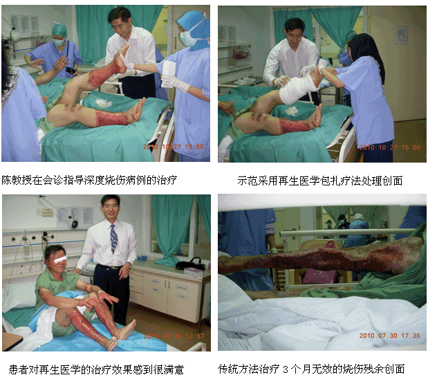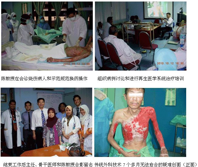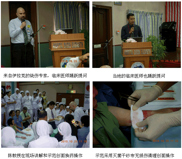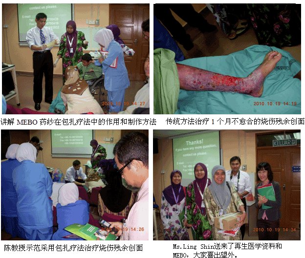 1、2010年10月11日上午7時30分,來自中國燒傷創(chuàng)瘍科技中心的陳永翀主任和負(fù)責(zé)馬來西亞學(xué)術(shù)推廣和醫(yī)療開發(fā)的Ms. Ling Shin Chew,應(yīng)馬來大學(xué)醫(yī)(UMMC)燒傷科負(fù)責(zé)人Dr. Margaret的邀請,來到了該院的外科病房會診和指導(dǎo)了3例疑難燒傷創(chuàng)瘍患者的治療,實(shí)現(xiàn)了很好的維護(hù)、提高再生醫(yī)學(xué)技術(shù)水平的效果。