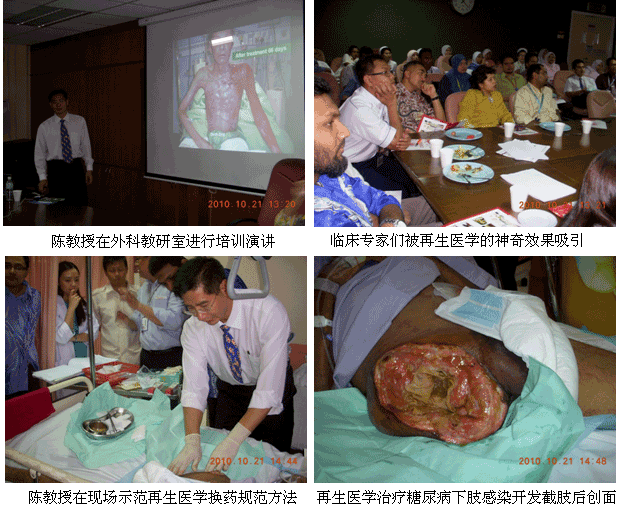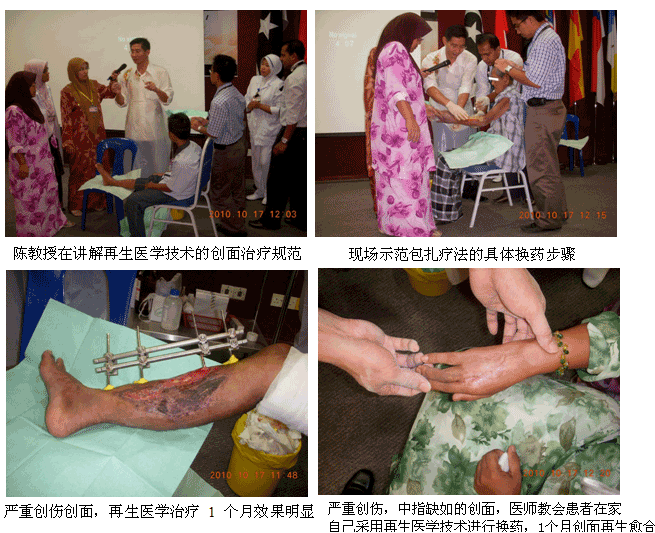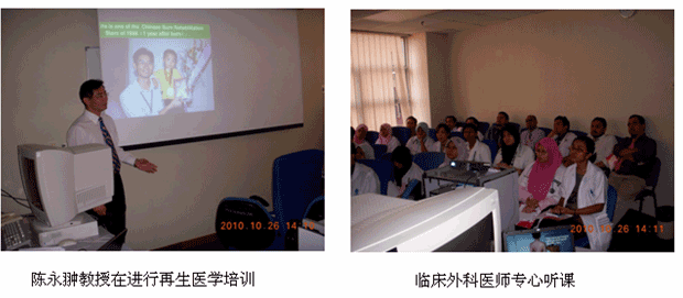 自從再生醫(yī)學(xué)學(xué)術(shù)演講在今年年7月在馬來西亞Kuching舉辦的亞太估計整形大會上引起轟動和強(qiáng)烈反響后,再生醫(yī)學(xué)的學(xué)術(shù)地位和影響力在亞太地區(qū),特別是在馬來西亞得到了明顯提升。為了發(fā)揮出學(xué)術(shù)的優(yōu)勢,趁熱打鐵在馬來西亞推廣再生醫(yī)學(xué)技術(shù),2010年10月10日至29日,馬來西亞今年的第三輪醫(yī)療開發(fā)與維護(hù)工作順利展開,收效顯著。在20天的時間里,先后舉辦了州級(省級)培訓(xùn)班2期,院級培訓(xùn)班7期,培訓(xùn)了燒傷、整形、普通外科、骨科、內(nèi)科的醫(yī)師和護(hù)士580余名;對 5家老基地醫(yī)院的臨床應(yīng)用與技術(shù)規(guī)范進(jìn)行了有效的維護(hù)、推進(jìn)和提高;成功新開發(fā)了4家新的大型政府教學(xué)醫(yī)院和1家大學(xué)醫(yī)院;會診、指導(dǎo)30多例危重疑難病例的救治[燒傷7例(特重度燒傷2例),創(chuàng)傷13例,慢性潰瘍11例,皮膚病1例,等],醫(yī)療開發(fā)與維護(hù)齊頭并進(jìn)。