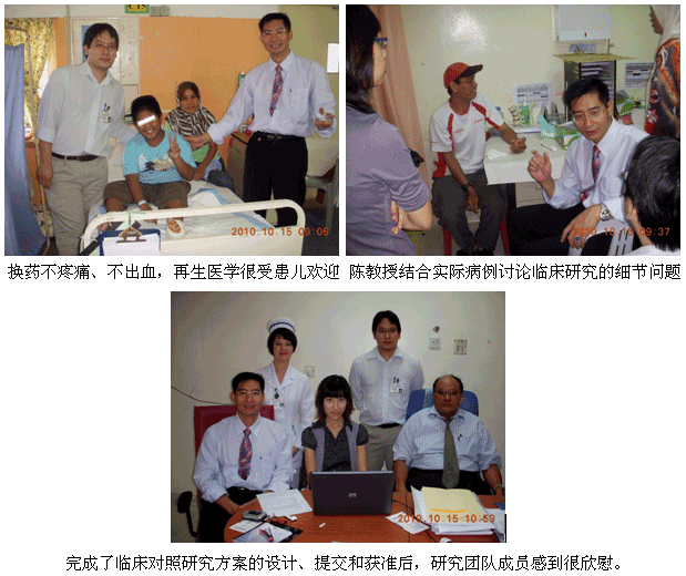 5、 10月15日,陳教授和Ms. Ling Shin再次應(yīng)Sultanah General Hospital (新山州中央醫(yī)院,當(dāng)?shù)刈畲蟮尼t(yī)院)醫(yī)院創(chuàng)傷骨科主任Dr. Thevarajan的邀請,到醫(yī)院進(jìn)行臨床指導(dǎo)和討論制定斷指再生的臨床研究方案.這是非常忙碌的一天,早上8時,陳教授剛到骨科的門診已有多位患者在等候,其中手指離斷損傷的有6例,創(chuàng)傷病例3例,陳教授均一一細(xì)心地查看和指導(dǎo),糾正治療過程中存在的一些不足和不夠規(guī)范的地方;處理完門診的患者后,陳教授在Dr.Yong的邀請下,來到病房為1例開放性骨折嚴(yán)重創(chuàng)傷軟組織缺損的小兒患者進(jìn)行了會診和指導(dǎo),患兒和家長對再生醫(yī)學(xué)治療的效果感到很滿意;處理完患者的治療后,陳教授、Dr. Thevarajan主任、Dr.Yong Aik Peng 和Ms.Ling Shin等共同討論了“A Large Sample Randomized Open-labeled Clinical Comparative Study on the Efficacy and Safety of Topically Applied Moist ExposedBurn Ointment (MEBO) and Opsite in Subjects with Finger Injuries”(MEBO與Opsite治療手指創(chuàng)傷的有效性與安全性的大樣本隨機(jī)臨床對照研究)的臨床研究課題,討論解決了方案中的一些具體問題,然后通過網(wǎng)絡(luò)在線報給了馬來西亞國家醫(yī)學(xué)臨床研究中心,獲準(zhǔn)立項,成為國家級的臨床研究項目,并開始實(shí)施。