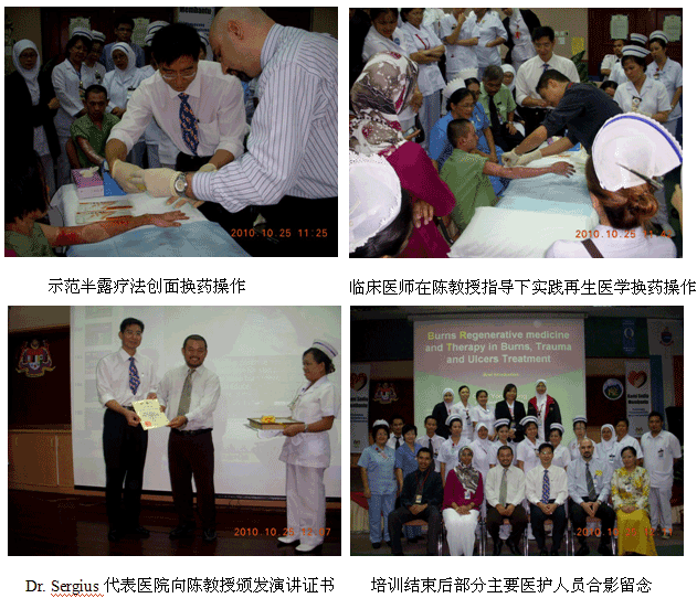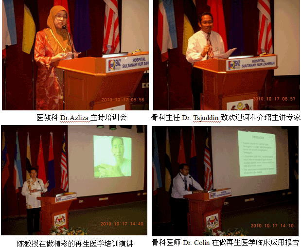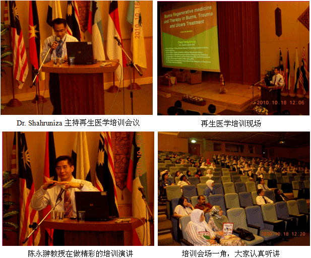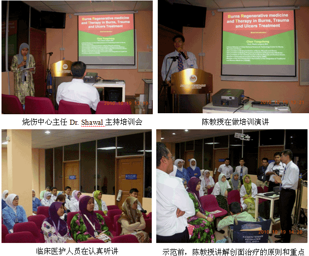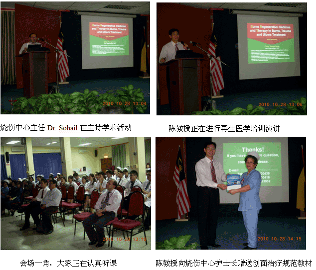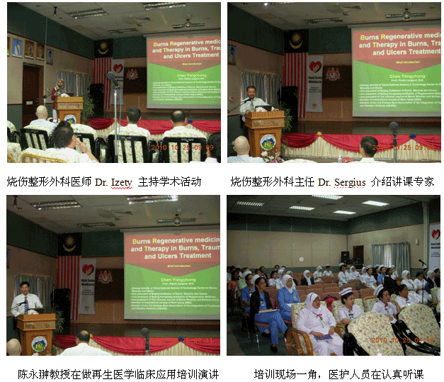 9、10月25日,再生醫(yī)學(xué)院級培訓(xùn)班在Hospital QEH (沙巴州中央醫(yī)院)學(xué)術(shù)報告廳舉辦,燒傷整形醫(yī)師Dr. Izety主持學(xué)術(shù)活動,燒傷整形中心主任Dr. Sergius介紹講課老師和談他參加國際會議認(rèn)識陳教授和了解到燒傷再生醫(yī)學(xué)的過程。來自該院的燒傷整形、普外、創(chuàng)傷骨科和急診科的60多名醫(yī)師、護(hù)士接受了再生醫(yī)學(xué)的培訓(xùn)。培訓(xùn)班還組織了2例燒傷病例的現(xiàn)場操作示范,通過現(xiàn)場示范,大家得以更全面和更直觀地學(xué)習(xí)和掌握再生醫(yī)學(xué)技術(shù)。培訓(xùn)結(jié)束后,該院馬上引進(jìn)和應(yīng)用燒傷再生醫(yī)學(xué)技術(shù)治療燒傷創(chuàng)瘍病人(目  前有1例37%的大面積特重度燒傷的患兒正在接受再生醫(yī)學(xué)治療)。