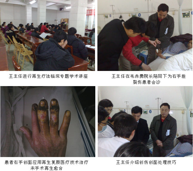 會(huì)后,王主任在該院院長(zhǎng)韋赤勇、醫(yī)務(wù)科科長(zhǎng)蔡凱及大外科主任、醫(yī)學(xué)專家等陪同下,深入該院創(chuàng)傷外科病房為幾例創(chuàng)瘍患者會(huì)診。韋赤勇院長(zhǎng)在同王主任的交流中講到,通過近兩年王主任到該院的多次臨床學(xué)術(shù)交流與指導(dǎo),對(duì)該醫(yī)院在治療臨床難愈性創(chuàng)瘍創(chuàng)面和大面積深度燒傷創(chuàng)面上起到了很好的臨床傳幫帶的作用,尤其是該院近期收治的右手挫裂傷及右足貫通傷患者均未行常規(guī)手術(shù)治療而是全程應(yīng)用再生復(fù)原醫(yī)療技術(shù)治療,現(xiàn)該患創(chuàng)面均自行愈合,右手和右足外觀和功能均得到了最大限度地恢復(fù)。韋赤勇院長(zhǎng)還表示,再生復(fù)原醫(yī)療技術(shù)有效地幫助了該院醫(yī)務(wù)人員解決了以前很難解決的臨床難題,目前再生醫(yī)療技術(shù)在該院的各科室都進(jìn)行了深入地推廣和應(yīng)用,今年該醫(yī)院要成立燒傷創(chuàng)瘍??疲愿玫脑旄YF港市廣大的創(chuàng)瘍患者。