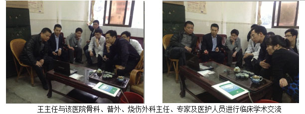 當(dāng)日下午3:00,王主任在該醫(yī)院外科辦公室進行臨床學(xué)術(shù)交流,該醫(yī)院的燒傷科范志強主任及科室醫(yī)護人員10余人參加了講座會議。會后該醫(yī)院泌尿、燒傷外科主任范志強邀請王主任對在該科住院的多例燒傷患者進行了會診和臨床指導(dǎo)。