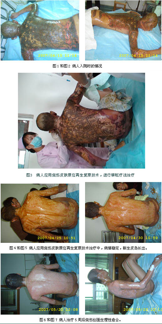 2007年4月13日13時(shí)04分,廣州花都中醫(yī)院收入一例成人燒傷,該患者蘇某某,男性,23歲。以“高溫漆料燙傷全身多處伴疼痛1小時(shí)”為主訴急診入院?;颊哂谌朐呵?小時(shí)工作時(shí),不慎被高溫脂類化學(xué)漆料燙燒傷全身多處,現(xiàn)場(chǎng)未作特殊處理,遂到花都中醫(yī)院急診求治,入院查體見(jiàn):T36.0℃,P82次/分,R20次/分,BP120/90mmHg,神清,急性痛苦面容,頭、面、頸、雙上肢、軀干、臀部皮膚焦黃,炭化,部分表皮撕脫,表皮撕脫處可見(jiàn)創(chuàng)面蒼白,呈蠟白樣,間焦痂樣物,無(wú)水皰,無(wú)滲出,觸痛遲鈍,面部見(jiàn)表皮破潰,少理脫落,紅白相間,觸痛明顯,雙眼瞼毛燒焦?fàn)睿p眼粗測(cè)視物無(wú)明顯異常,右耳輪呈蒼白色。入院診斷:高溫漆料全身燒傷總面積32%TBSA(深二Ⅱ度11%、淺Ⅲ度21%),特重度燒傷。入院后對(duì)患者創(chuàng)面處理全程應(yīng)用我國(guó)著名生命科學(xué)家徐榮祥教授發(fā)明的燒傷皮膚原位再生醫(yī)療技術(shù),進(jìn)行抗休克、抗感染、營(yíng)養(yǎng)支持、臟器功能保護(hù)等全身綜合治療,并在中國(guó)中西醫(yī)結(jié)合學(xué)會(huì)燒傷專委會(huì)常委、北京燒傷創(chuàng)瘍研究所副所長(zhǎng)、臨床部王洪生主任的全程臨床指導(dǎo)下,患者順利的度過(guò)了休克關(guān)、感染關(guān),深Ⅱ度及淺Ⅲ度創(chuàng)面分別于傷后3周及5周左右生理性愈合。該患者的成功救治充分證明了燒傷皮膚原位再生醫(yī)療技術(shù)的顯著臨床治療效果。