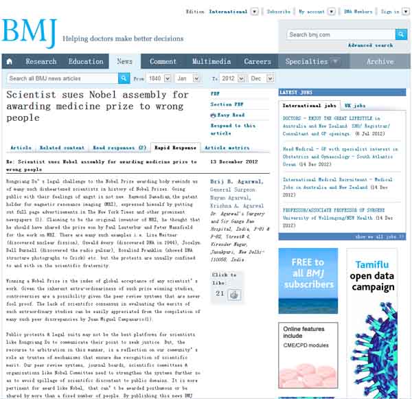 對于像徐榮祥這樣的科學(xué)家來說,公眾抗議和法律訴訟可能不是發(fā)表觀點、尋求正義的最好平臺。但是,這種求助于法律仲裁的手段卻反映了我們作為那些確??茖W(xué)成就獲得應(yīng)有認可的各機構(gòu)的委托方在發(fā)揮作用時是存有問題的。我們的同行審查系統(tǒng)、雜志董事會、科學(xué)委員會以及像諾貝爾委員會這樣的組織都需要進一步加強體制以避免科學(xué)領(lǐng)域內(nèi)的紛爭流溢到社會公共領(lǐng)域;特別是對諾貝爾獎這樣的獎項而言,這樣的獎項不能授予給已去世的人、也不能被超過一定數(shù)量的人所共享。英國醫(yī)學(xué)雜志(BMJ)能發(fā)布這一訴訟消息就已然說明科學(xué)雜志也應(yīng)履行起“看門人”的職責(zé)而不只是承擔(dān)“啦啦隊長”的責(zé)任。