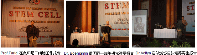 由印度尼西亞(印尼)醫(yī)師學(xué)會主辦的國家級醫(yī)學(xué)繼續(xù)教育項(xiàng)目(CME):“NATIONAL SEMINAR & DISCUSSION ‘STEM CELL’ Research & Application in Indonesia 2010” (2010年印尼‘干細(xì)胞’研究與應(yīng)用全國研討會),于2010年10月23日至24日在印尼首都雅加達(dá)市的Aryaduta Hotel酒店隆重召開。來自印尼衛(wèi)生部、多個干細(xì)胞研究所、大學(xué)細(xì)胞實(shí)驗(yàn)室和全國各地臨床醫(yī)院的專家、教授和醫(yī)師180多人參加了本次大會,其中包括了印尼衛(wèi)生部負(fù)責(zé)干細(xì)胞研究與應(yīng)用工作的Dr.Binsar H.主任,印尼干細(xì)胞研究學(xué)會的會長、印尼大學(xué)醫(yī)學(xué)院婦產(chǎn)與胚胎生育研究中心的主任Prof.Farid Anfasa 教授,印尼國家癌癥與干細(xì)胞研究所的所長Dr.Boenjamin Setiawan, 前印尼燒傷學(xué)會主席、前印尼大學(xué)燒傷整形外科主任Prof. Chaula教授,印尼大學(xué)燒傷整形外科主任、在MEBO原位培養(yǎng)干細(xì)胞治療燒傷領(lǐng)域獲得成功的Dr.Aditya和在CEA(自體表皮培養(yǎng)移植)領(lǐng)域有一定應(yīng)用經(jīng)驗(yàn)的Dr.Yefta等在印尼干細(xì)胞的研究應(yīng)用領(lǐng)域較有成就和影響力的專家、教授出席了這次大會??梢哉f,這是印尼最高級別的干細(xì)胞研究與應(yīng)用的學(xué)術(shù)研討會。