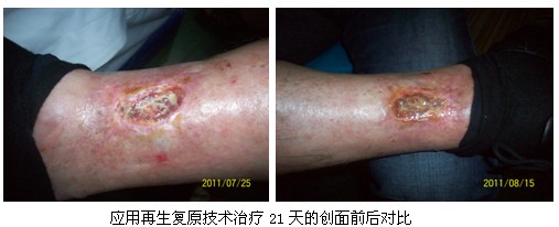藥治療。患者曾在連云港市中醫(yī)院燒傷科接受過陸敏康主任的會診。8月15日~17日,杜福勤主任再次為其會診,該患經(jīng)1個月再生復原醫(yī)療技術的治療其創(chuàng)面已有明顯好轉(zhuǎn)。