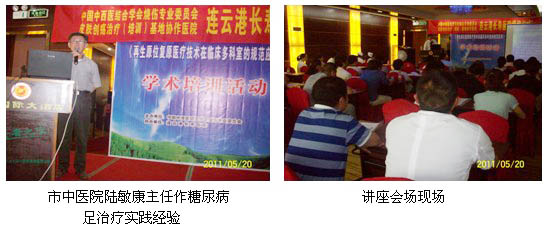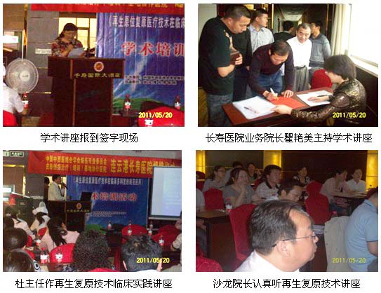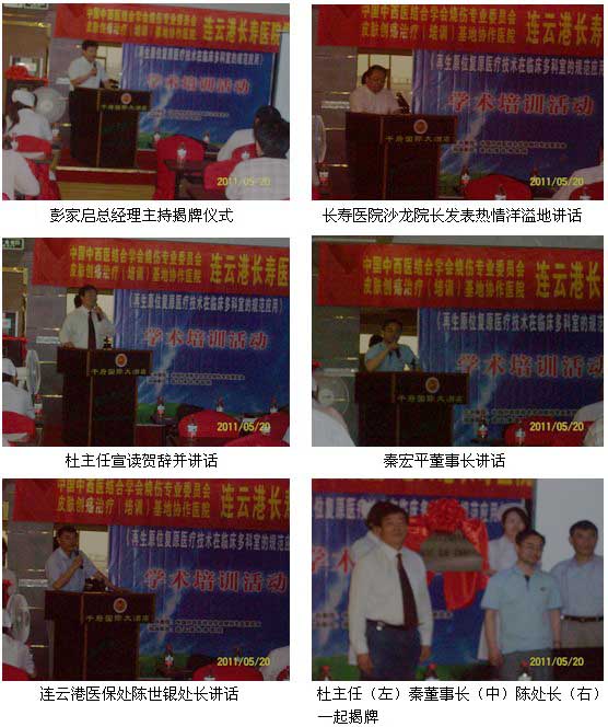 2011年5月20日上午8:00時,在連云港千府大酒店會議廳舉行了連云港長壽醫(yī)院為皮膚原位再生復(fù)原醫(yī)療技術(shù)的培訓(xùn)醫(yī)院揭牌儀式暨皮膚原位再生復(fù)原醫(yī)療技術(shù)培訓(xùn)學(xué)術(shù)講座,中國中西醫(yī)結(jié)合學(xué)會燒傷專業(yè)委員會常委、北京美寶燒傷創(chuàng)瘍研究所臨床部杜福勤主任和學(xué)會駐江蘇省辦事處劉恒主任,連云港蘇云集團(tuán)秦宏平董事長、彭家啟總經(jīng)理、連云港醫(yī)保處陳世銀處長、沙龍院長、瞿艷美業(yè)務(wù)院長及邀請的有關(guān)醫(yī)院的專家和醫(yī)護(hù)人員共60余人參加了揭牌儀式。