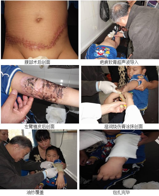 參會期間,金教授應邀再次來到三峽大學仁和醫(yī)院手外整形科,為一位五歲左右的小男孩會診疤痕皮膚的治療。患者左臂燒傷,從腹部取皮移植到手臂上,術(shù)后兩周腹部疤痕開始使用疤痕軟膏,已做導入治療一周,手臂還有黑痂。患者母親自述使用軟膏后疤痕變軟,金教授為小患者耐心做了疤痕軟膏導入治療,并為手臂換藥推薦了再生醫(yī)療技術(shù)濕性療法。主治醫(yī)師羅醫(yī)生和護理人員們也學習了濕潤燒傷膏油紗條的制作和規(guī)范換藥方法。