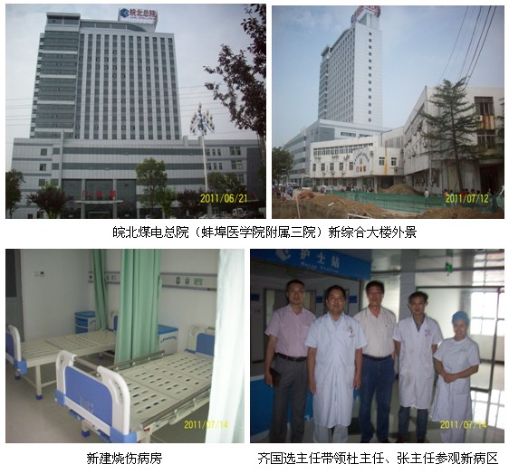 醫(yī)院開放床位800余張,設(shè)置23個病區(qū),33個亞???,5個市級重點、特色學科。開設(shè)有心內(nèi)科、內(nèi)分泌科、血液科、腎內(nèi)科、呼吸內(nèi)科、消化內(nèi)科、神經(jīng)內(nèi)科、兒科、新生兒科、重癥監(jiān)護、心胸外科、腫瘤外科、放療科、化療科、泌尿外科、燒傷整形美容科、骨科、肝膽外科、甲乳???、神經(jīng)外科、婦產(chǎn)科、小兒外科、肛腸科、麻醉科、SICU、康復(fù)科、輔助檢查等30多個臨床二、三級??啤?BR>      2011年7月7日~16日,應(yīng)皖北煤電總醫(yī)院燒傷整形科齊國選主任的再次邀請,中國中西醫(yī)結(jié)合學會燒傷專業(yè)委員會委員、北京美寶燒傷創(chuàng)瘍研究所臨床部主任杜福勤教授應(yīng)邀再次前往該院示范指導(dǎo)治療燒傷創(chuàng)瘍患者。經(jīng)過兩周的示范指導(dǎo)和治療,應(yīng)用再生復(fù)原醫(yī)療技術(shù)治療的患者(燒傷患者7例、燒傷植皮后患者2例、燒傷后創(chuàng)面潰瘍1例),患者最大年齡91歲,最小者9個月。7月14日,安徽省區(qū)張朝軍主任和吳崇巍同志到皖北總院,張朝軍主任和齊國選主任交流了再生復(fù)原技術(shù)和再生產(chǎn)品的引進與技術(shù)協(xié)作以及下一步舉辦再生技術(shù)講座等有關(guān)事宜。