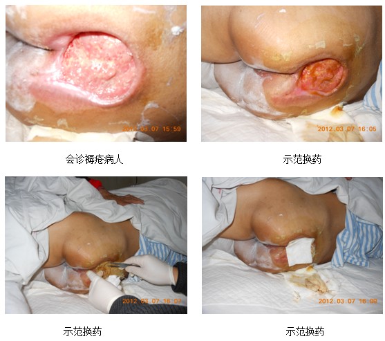 2012年3月7日,應(yīng)黃岡市中心醫(yī)院燒傷整形美容科主任馮先才的邀請(qǐng),中國(guó)燒傷創(chuàng)瘍研究所研究員、中國(guó)燒傷創(chuàng)瘍科技中心主任金黨軍老師到該科室會(huì)診一例褥瘡患者,該患者年齡72歲,創(chuàng)面直徑13cm,且創(chuàng)面周圍皮下均有空腔。金老師到病床前查看患者創(chuàng)面,親自給患者換藥,同時(shí)跟醫(yī)生講解燒傷膏的使用方法,以及油紗的制作和加壓包扎的規(guī)范操作。