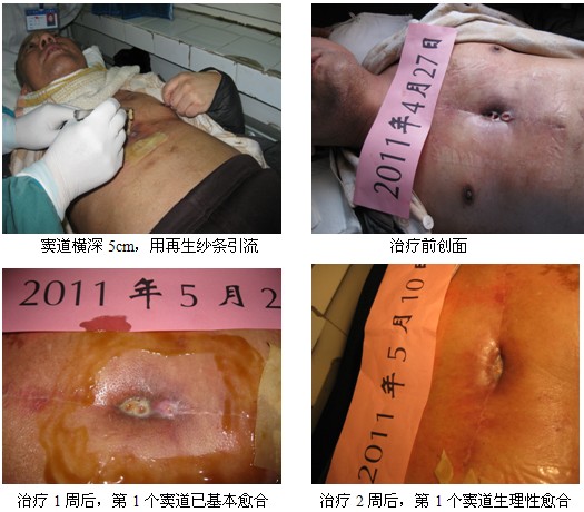 通過1周的治療,其中1個竇道被修復,體溫由原來的38.5℃下降到36.4℃,咳嗽較前明顯減輕。治療到2011年5月17日,2個竇道已達到生理性愈合,患者體溫穩(wěn)定在36.4℃~36.6℃之間,通過物理治療,患者已不再咳嗽,食欲明顯好轉(zhuǎn),大小便正常。第3個竇道在皮膚原位再生醫(yī)療技術的規(guī)范治療下正在康復中。